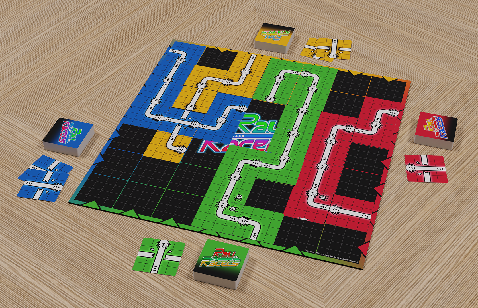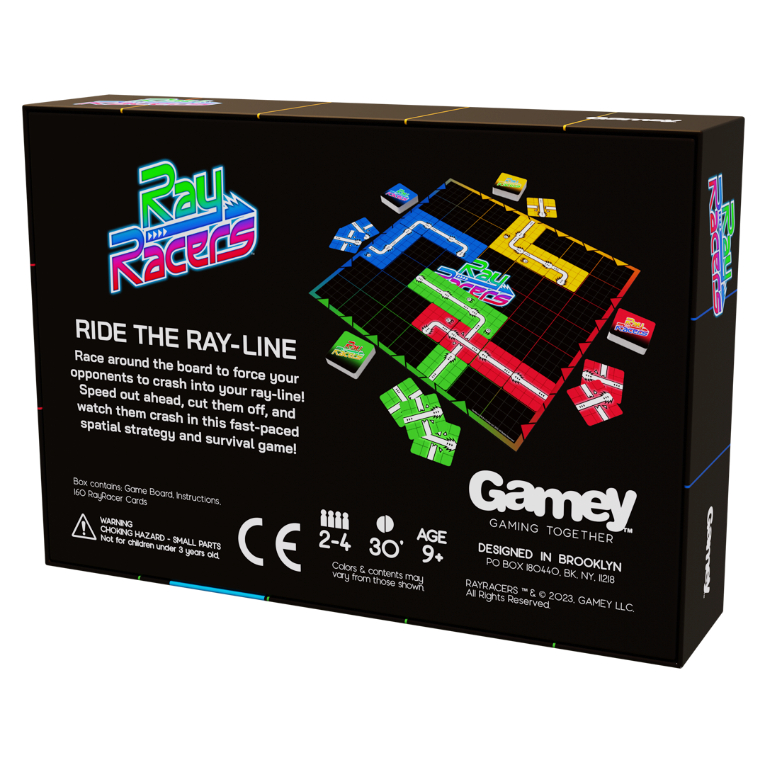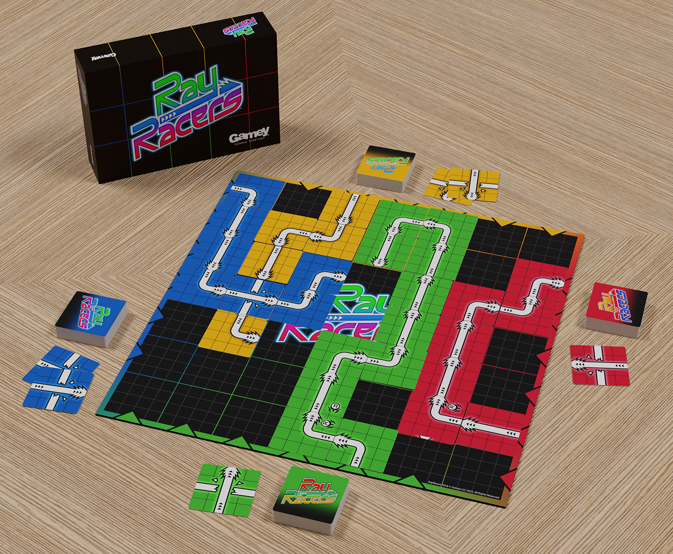 RayRacers is a fast-paced spatial strategy and survival game for 2-4 players. Players simultaneously place their cards on a game grid to create ray-lines, moving across the grid and making obstacles for their opponents to crash into. The last surviving player wins!